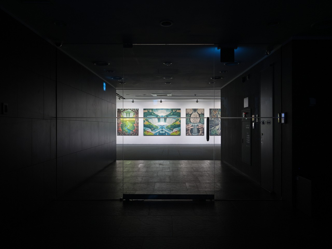 그 답을 찾기 위해서 또 다른 중요한 구조인 소실점을 살펴보자. 소실점은 어느 하나의 지점으로 귀결되는 위계적인 구조처럼 보이지만, 사실 그 끝이 보이지 않는 가상의 지점을 통해 화면에서 깊이감을 만들어 내는 데 효과적이다. 그러면 소실점 너머에 존재하는 저 너머의 세상은 도대체 어떤 곳일까? 먼저 우리가 저 멀리 무엇인지 모를 소실점을 도달해야 하는 목적지로 이해하고 그 앞에 서 있다고 가정해 보자. 우리는 알 수 없는 모험의 길을 떠나는 것과 같은 상황일 것이다. 그렇다면 지금 여기와 다른 방향의 길로 들어서는 선택을 하는 출발점은 오히려 지금 여기라는 위치를 재인식하게 만드는 근거가 된다. 그 지점에 존재하기에 다른 곳으로 떠날 수 있기 때문이다. 다시 길을 걷는 우리를 상상해 보자. 우리는 소실점이라는 통로의 끝을 예측하는 것보다는 거기까지 다다르기 위해 겪어야 하는 여러 일들을 고스란히 느끼는 경험을 하게 될 것이다. 이러한 소실점의 기능은 작가 자신이 느끼면서 다시 자신의 환경을 돌아보는 일, 그것이 주는 발견의 경이로움을 의도하는 것이다. 그렇다면 우리는 어디에 도달하게 될까? 그 답은 소실점에 있다. 이를 전시 제목인 ‘거울’과 연결해 본다면, 이 소실점은 도달할 수 없는 가상의 것에서 벗어나 또 다른 소실점으로 이어지는 공간을 열어준다. 그것은 내 앞에 존재하는 것이 아니라 나의 뒤로 펼쳐지는 현실의 공간이다. 다시 말하면 작가의 그림 속 아득히 먼 곳을 바라보는 시선 너머로 이어지는 길을 이어 나가면 다시 우리가 사는 세상으로 돌아오게 된다. 이런 방식으로 그의 그림은 또 다른 대칭으로 균형을 이룬다. 이와 같이 《거울 회랑》은 좌우 대칭의 구조와 동시에 작용함으로써 그가 그리는 가상과 현실을 거울처럼 비춰주는 것뿐만 아니라 현실에서 출발해 가상을 지나 다시 현실로 돌아오는 대칭적인 순환구조를 만들어 내고 있다. 그렇지만 우리가 미처 듣지 못하고 보지 못한 것과 이미 체득한 세상 사이에서 시선을 따라서 돌아온 소실점은 이전과는 다른 새로운 현실로 나타난다. 이렇게 그의 그림이 의도하는 시선의 흐름만으로도 지금 여기를 변하게 만들 힘을 가지고 있는 것으로 보인다. 아무리 떨쳐버리려 해도 우리의 삶은 여러 선택의 길로 이루어지지만, 이쪽이나 저쪽에서 봐도 ‘나’라는 소실점으로 귀결된다. 이렇듯 그는 삶이라는 모험이 가진 현실적 두려움과 불안이 가진 가능성을 작가적 상상력을 통해 그가 그리는 허구의 시공간에 담아 새로운 현실로 우리에게 다가오게 만든다. 이는 단순히 앞에 놓인 한 방향의 미래로 진행되는 맹목적 진행이 아니라 뒤에서 나를 비추고 있는 과거의 경험을 현재로 끌어오는 반복적인 순환구조와 연동된다. 결국 그가 그림을 통해 이야기하는 것은 우리가 바라보려 하는 것이 저 멀리 보이지도 않는 곳에 존재하는 것이 아니라 언제나 우리 주변에 있다는 현실을 계속해서 인식하게 만들어 균형을 유지하는 것이다. 여기서 소실점은 거울과 통로의 역할을 통해 앞과 뒤, 옆과 또 다른 옆, 가상과 현실을 이어내어 이들의 균형을 가능하게 하는 장치이다.