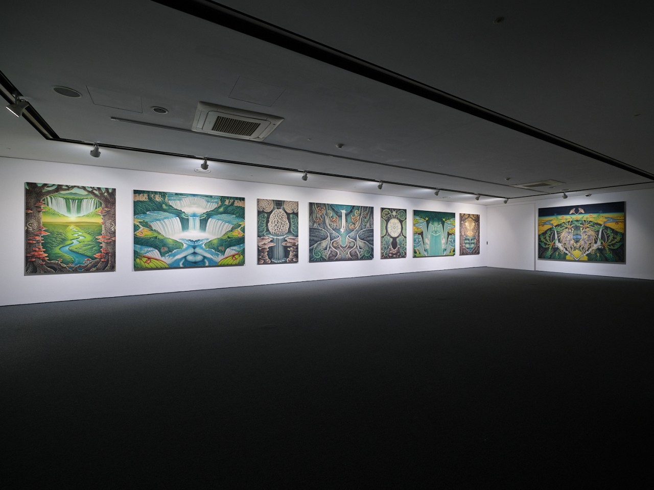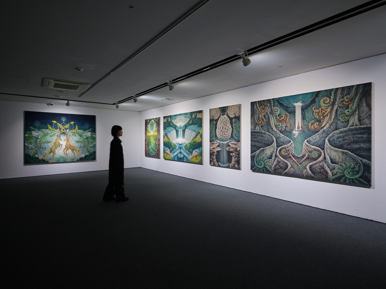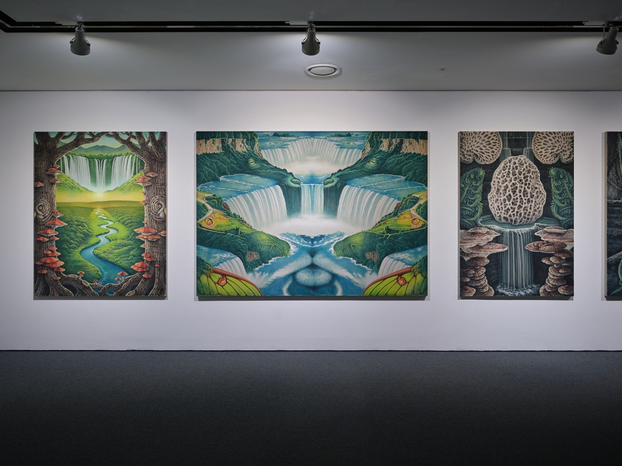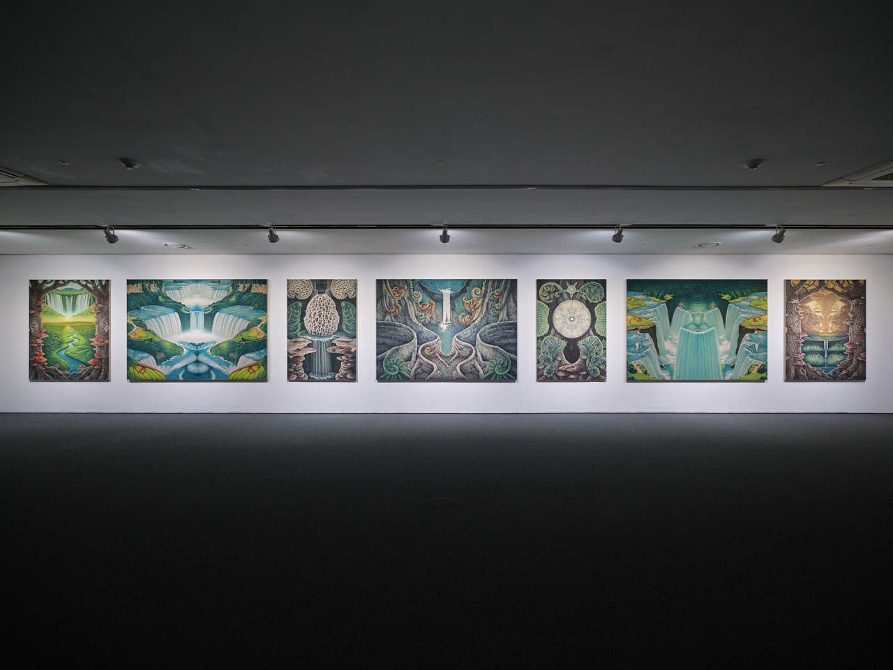 이번 전시에서는 이러한 특징과 더불어 전시와 작품을 구성하는 구조가 두드러진다. 하나는 글의 앞에서 언급했던 그림과 전시 안에서 펼쳐지는 좌우대칭의 균형이다. 작가는 동일한 제목을 가진 작업을 두 점씩 제작하였고, 이들은 <소실점>을 중심으로 좌우로 나란히 배치되어, 좌우대칭을 이루고 있다. 균형을 맞춘다는 것은 한편으로 안정적인 느낌을 주지만, 이것이 반복되면 강박적 집착과 같은 답답함이 느껴지기도 한다. 그럼에도 작가는 그림의 표면에서 만들어가는 신령스럽고 질서 정연한 대칭적 표면으로 구성된 풍경 속에서 미세한 형태를 변주하고, 숨은그림찾기와 같은 구체적 형상을 덧입혀 균형과 강박의 층위를 쌓아 나간다. 이뿐만 아니라 전시장 전체를 작품에 그려진 풍경 속 소실점 너머에 존재하는 세계로 진입하기 위한 좌우대칭의 회랑으로 연출하고자 하였다. 그의 작업에서 나타나는 대칭적 균형은 계곡, 동굴, 평원, 폭포와 같이 깊이를 알 수 없는 아득히 먼 곳으로 나타난다. 그것은 이질적인 것을 서로 결합하고 거울처럼 서로를 비추어 마주 보게 만드는 상황을 연출하여 마치 새로운 세상으로 가는 입구처럼 보이기도 한다. 한편으로는 이들의 구성은 복잡한 상호 관계에서 발생하는 접점들로 인해 서로 이질적인 감각들이 충돌하면서도 조화롭게 그려진다. 여기서 주목되는 것은 그의 공간이 요동치는 불안정한 상태가 아니라 표면적으로는 평온하고 장엄하게 분위기를 가진다는 점이다. 하지만 그의 그림처럼 고요하고 깊이를 알 수 없는 평온은 사실상 가상의 시공간이기에 가능한 것이다. 이렇게 본다면 그가 바라보고 겪고 있는 현실 속에서의 불안과 두려움은 직접적으로 그림에 나타나지 않지만 그의 작업에서 균형과 조화로 이루어진 세상에 대한 갈망과 함께 동시에 표출되고 있다. 이번 작업이 고요하고 아름답게 보이면서도 생명력 가득한 생기 있는 공간으로 보이지 않는 기묘한 풍경으로 보이는 것은 이런 이유에 기인한 것으로 보인다. 그렇다고 해서 이러한 좌우대칭의 균형은 작가에게 있어 고정되고 안정된 가상 세계를 구축하여 그것에 어떤 미래에 대한 바람을 담거나 현실을 회피하기 위해 사용하는 것은 아니다. 오히려 이러한 방식은 다르면서도 닮아 있는 서로를 비추는 현실과 가상 사이에서 떼어놓을 수 없는 두 상황을 모두 직시하려는 작가의 태도를 상징적으로 보여주고 있다고 여겨진다. 그렇다면 그의 작업을 그저 가상의 풍경으로만 보아야 할까?