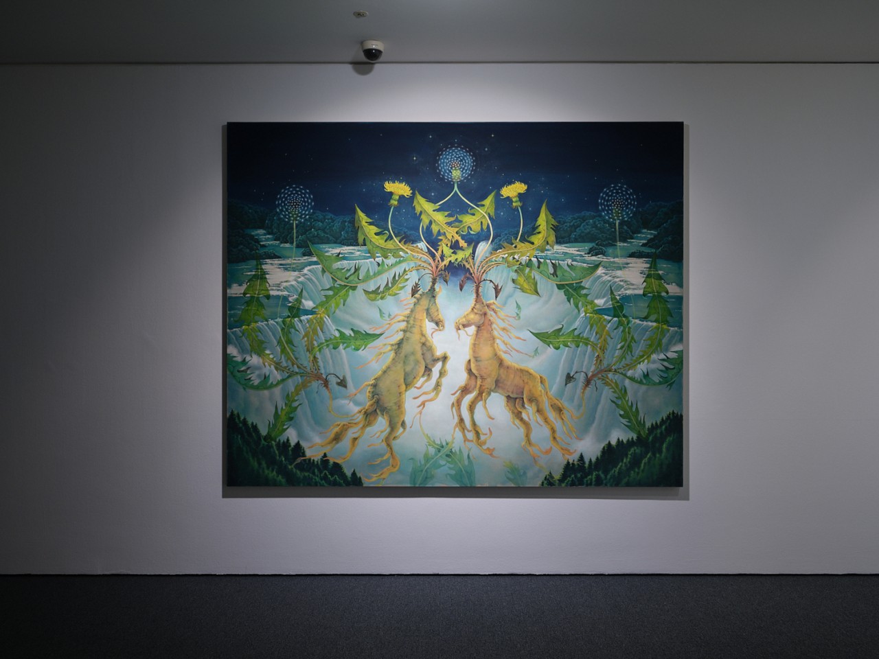First, let us examine his paintings. Something seems strange about the surroundings of the waterfall in New Age Niagara 1 and New Age Niagara 2. The eyes, nose, and mouth of a sheep are visible, and on the other side appears a field composed of moth wing patterns. Not only that, but in Symphony of Owls 1 and Symphony of Owls 2, the trees themselves are owls with mushrooms growing atop them. In Mirror Corridor 1 and Mirror Corridor 2, dandelion roots shaped like dynamic horses appear. In Mirror Garden 1, Mirror Garden 2, and Vanishing Point, plants such as bracken ferns, mushrooms, and dandelion seeds are magnified and positioned like gigantic structures. The earth and sky are like a single living organism; trees are foundations where animals and mushrooms coexist; and plants take on the appearance of dynamic animals or form massive architectural structures. In fact, these are flora and fauna that have already often appeared in his work. However, in this body of work, rather than revealing their individual characteristics, they appear in a homogenized form as if stained by and permeated into each other. In depicting mysterious natural scenery, Jang imbues the landscape with an intimate allure through its diverse life forms—making it feel like a world entirely their own, where we have never ventured. As such, the world Jang imagines appears like a result that suddenly emerged at some moment, completely unrelated to us. From what is depicted, we cannot logically deduce whether this place arose transformed through some cyclical process of generation. We merely feel complex and subtle emotions through the unfamiliar sensation of atmospheres that have permeated each other as different beings coexisted for a long time in a state where human existence is excluded. Therefore, standing before it, we strongly recognize the absence of the self in this unfamiliar form different from the space-time we currently inhabit. Thus, when standing before a landscape without me, as in his paintings, we inevitably trace backward through that virtual world by comparing it with the world we live in, as if looking into a mirror. This is the characteristic of his paintings that reflect on reality through a virtual world.