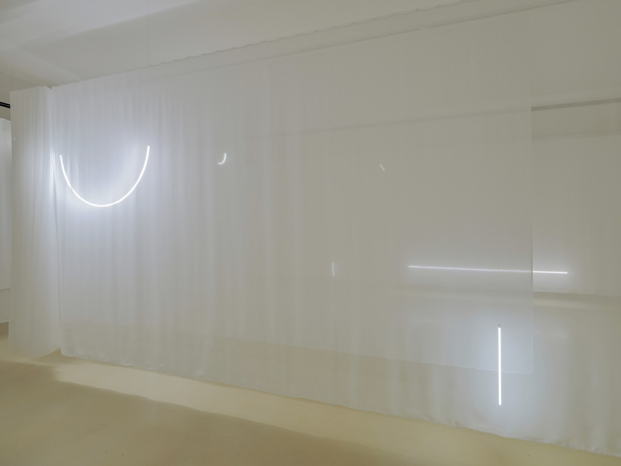 그렇다면 이제 빛에 관한 이야기로 넘어가 보자. 사물이 가장 강한 열을 낼 때 빛은 하얀색을 띤다. 또한 백색광은 사물을 있는 그대로 보여주어 색이 없는 것처럼 느껴지는 빛이다. 이렇게 그가 사용하는 하얀 빛은 가장 충만하지만 거의 없는 듯이 느껴지는 존재이다. 이렇게 이번 전시에서 빛은 하얀색을 강조하면서 동시에 시각적으로 비어버린 공간을 드리우는 역할을 하고 있다. 작가의 이전 작업이 비어있는 공간을 무엇인가 연결되어 채워진 공간으로 머릿속에서 인식하게 했다면, 이번 작업은 이를 시각적으로 볼 수 있는 실재하는 빛으로 이를 대체하고 있다. 빛은 천으로 구분되는 공간을 채우고 그 경계인 천을 다시 밝혀주는 동시에 그 경계 너머에 있는 전시 공간을 비추기도 한다. 정도의 차이는 있지만 전시장과 관객에게 빛이 닿지 않는 곳은 없다. 따라서 우리는 눈으로 보는 빛과 함께 온전히 그 빛을 몸으로 받아들이게 된다. 이는 그의 작업을 실재하는 공간에 균열을 내어 그곳에 무엇인가를 존재하게 만드는데, 그것은 분리된 것 속에서 실재하며, 온전히 하나의 것이면서도 각자의 것으로 분리되는 방식으로 새로운 균열을 계속해서 만들어 낸다. 이는 어떤 시각적 움직임에 의해 공간을 가로질러 미끄러지는 것이 아니라 그 공간에 가만히 놓여있는 빛에서부터 퍼져나간다. 그래서 작품 밖에서 특정한 시점에서 보면 빛은 그곳을 마치 안개로 가득한 밀도 높은 공간으로 보이기도 하고, 천이 열린 부분에서 본다면 그것은 빛 그 자체로 인식될 뿐이다. 이렇듯 그에게 빛은 고정된 것이 아니라 관객의 움직임과 그에 따른 시선의 위치로 인해 정점에 다다르다 다시 흩어지고 다시 정점에 이르는 변화된 모습을 보인다. 어떻게 보면 그의 작업에 설치된 하얀 천과 빛은 서로를 이어주거나 서로를 방해하면서 각자의 방향을 새롭게 설정하는 계기를 스스로 부여하고 있는지도 모르겠다. 그렇기에 이전 작업은 그것을 구성하는 것들의 인과적인 연결로 인해 팽팽한 긴장감을 주로 드러냈다면, 이번 작업에서는 여기에 더해 무엇인가 긴장이 이완되어 가볍게 떠 있는 듯한 느낌을 받게 된다.