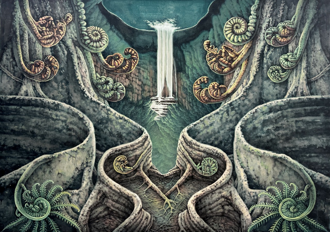 Jang Jongwan has steadily depicted landscapes of what appears to be an ideal natural world and the ecosystem that exists within it. Current exhibition, Mirror Corridor shows another direction in his work while not departing from the trajectory he has been pursuing thus far. To borrow Jang's words, these paintings fold and unfold like a decalcomania technique, forming a single topography. This place is not an actual space-time but rather a virtual world that borrows the form of an ideal realm, maintaining balance within a structure that endlessly repeats and replicates itself. Though his work is not grounded in any clear narrative, it evokes the worldview of a fantasy novel or film. As we know, fantasy novels and films are not entirely newly created worlds but are inevitably recreated based on various elements that constitute today's society, drawing from the history we have built up to now. This is a new reality space that resembles today's reality but has been formed in a different direction. Therefore, his work can be understood as a once-unified space-time, where reality and the virtual emerge from each other like decalcomania. Thus, what Jang imagines is not an independent world far removed and separated from us, but something that adheres most closely to us. Though it may feel like a complex story of space-time, it becomes easy to understand if we imagine various possibilities. First, if we consider that the space-time we inhabit is a reality created based on certain choices within the historical flow of human society, it would be good to think about what the world would look like differently if each of those choices had proceeded otherwise. Adding to this, as often appears in science fiction films, let us imagine what the starting point would look like if we discovered a planet with an environment similar to Earth somewhere in the universe and settled there to create a new society. That such imaginative possibilities arise before his work is perhaps because the world he depicts—like that of a fantasy or science fiction writer—is a virtual space-time containing various elements that shape his life and hopes for the future. Then, we must begin with the fundamental question of what Jang wants to show us through his paintings.