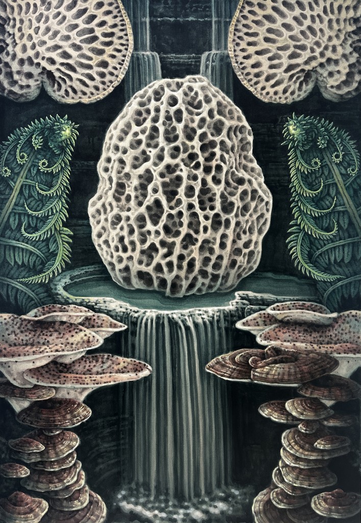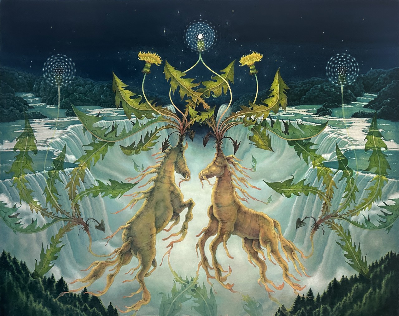 First, let us examine his paintings. Something seems strange about the surroundings of the waterfall in New Age Niagara 1 and New Age Niagara 2. The eyes, nose, and mouth of a sheep are visible, and on the other side appears a field composed of moth wing patterns. Not only that, but in Symphony of Owls 1 and Symphony of Owls 2, the trees themselves are owls with mushrooms growing atop them. In Mirror Corridor 1 and Mirror Corridor 2, dandelion roots shaped like dynamic horses appear. In Mirror Garden 1, Mirror Garden 2, and Vanishing Point, plants such as bracken ferns, mushrooms, and dandelion seeds are magnified and positioned like gigantic structures. The earth and sky are like a single living organism; trees are foundations where animals and mushrooms coexist; and plants take on the appearance of dynamic animals or form massive architectural structures. In fact, these are flora and fauna that have already often appeared in his work. However, in this body of work, rather than revealing their individual characteristics, they appear in a homogenized form as if stained by and permeated into each other. In depicting mysterious natural scenery, Jang imbues the landscape with an intimate allure through its diverse life forms—making it feel like a world entirely their own, where we have never ventured. As such, the world Jang imagines appears like a result that suddenly emerged at some moment, completely unrelated to us. From what is depicted, we cannot logically deduce whether this place arose transformed through some cyclical process of generation. We merely feel complex and subtle emotions through the unfamiliar sensation of atmospheres that have permeated each other as different beings coexisted for a long time in a state where human existence is excluded. Therefore, standing before it, we strongly recognize the absence of the self in this unfamiliar form different from the space-time we currently inhabit. Thus, when standing before a landscape without me, as in his paintings, we inevitably trace backward through that virtual world by comparing it with the world we live in, as if looking into a mirror. This is the characteristic of his paintings that reflect on reality through a virtual world.