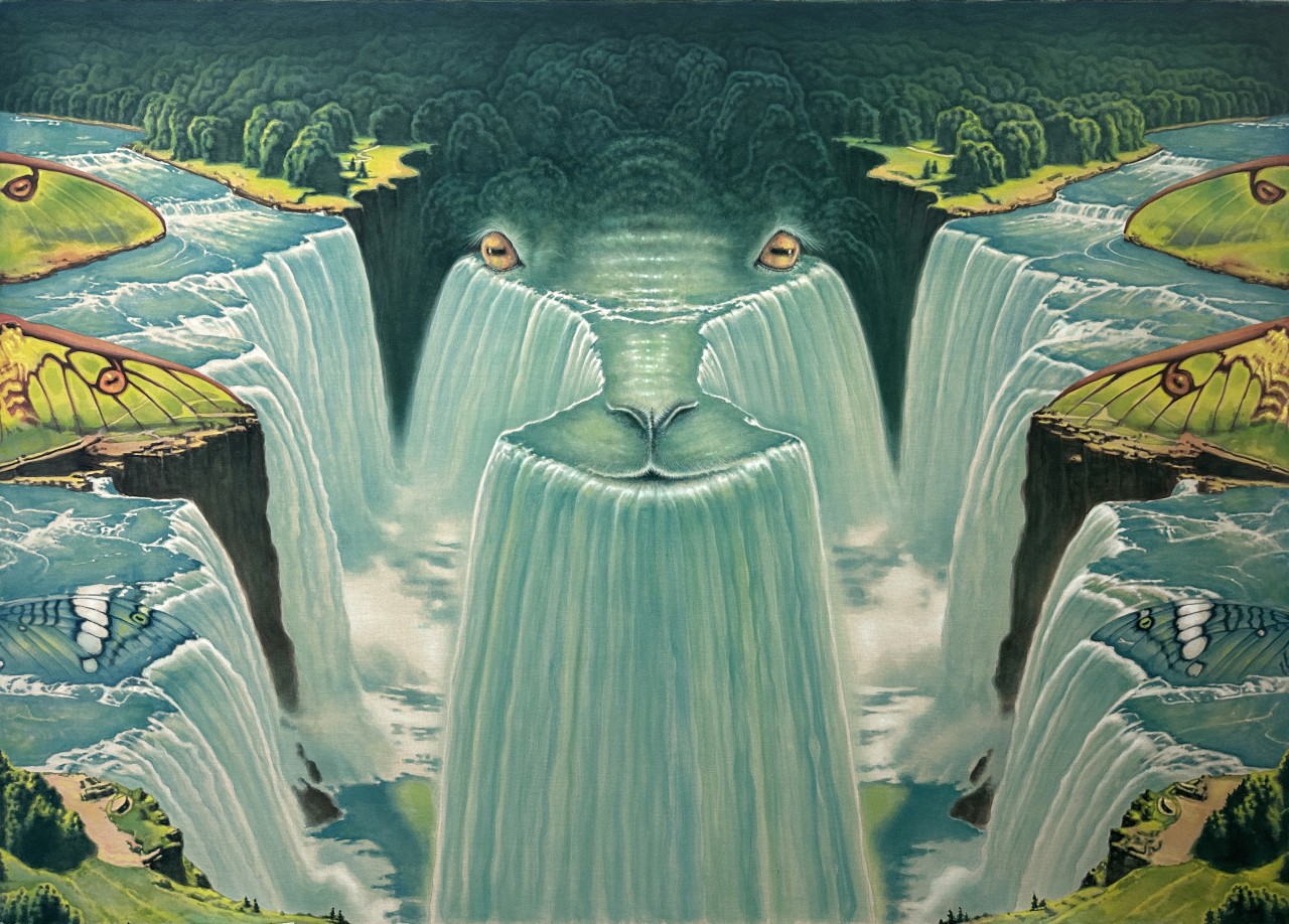 먼저 그의 그림을 살펴보자. <뉴 에이지 나이아가라 1>, <뉴 에이지 나이아가라 2>의 폭포 주변의 모습이 뭔가 이상하다. 양의 눈과 코와 입의 모습이 보이고 다른 한편엔 나방의 날개 문양으로 이루어진 들판이 나타난다. 그뿐만 아니라 <부엉이 교향곡 1>, <부엉이 교향곡 2>에는 나무 그 자체가 부엉이이고 그 위로 버섯들이 자라고 있다. <거울 회랑 1>, <거울 회랑 2>에는 역동적인 말의 모습을 한 민들레 뿌리가 등장한다. <거울 정원 1>, <거울 정원 2>, <소실점>에서는 고사리, 버섯, 민들레 홀씨 같은 식물이 확대되어 거대한 구조물같이 자리 잡고 있다. 대지와 하늘은 마치 하나의 생명체 같고, 나무는 동물과 버섯이 공존하는 토대이고, 식물은 역동적인 동물과 같은 모습, 혹은 거대한 건축적 구조를 이룬다. 사실 이들은 그의 작업에 이미 종종 등장했던 동식물이다. 하지만 이번에 작업에서 이들은 개별적 성격을 드러내기보다는 서로에게 물들고 스며든 것 같은 동질화된 모습으로 나타난다. 이렇듯 그가 그리는 풍경은 자연의 신비로운 풍경을 그려내면서도 그 속에서 찾아볼 수 있는 다양한 생명체의 모습이 주는 은밀한 매력으로 인해 마치 우리의 손길이 닿지 않은 그들만의 세상인 것 같이 보인다. 이처럼 그가 상상하는 세상은 전혀 우리와 관계없이 어느 순간 갑자기 나타난 결과물과 같은 모습이다. 우리는 이곳이 무엇인가가 생성되는 순환의 과정에서 변형되어 나타났는지, 그곳에 그려진 것을 통해 논리적으로 유추하기 힘들다. 다만 인간 존재가 배제된 상태에서 다른 존재끼리 오랜 시간을 공존하며, 서로에게 배인 공기들로 어우러진 낯선 감각을 통해 복잡 미묘한 감정을 느끼게 될 뿐이다. 그래서 그 앞에 선 우리는 지금 살고 있는 시공간과 다른 낯선 모습으로 ‘나’의 부재를 강하게 인식하게 된다. 따라서 그의 그림과 같이 내가 없는 풍경 앞에 서면 거울을 보듯이 우리가 살아가는 세상과 비교하면서 그 가상의 세계를 거꾸로 더듬어 나갈 수밖에 없다. 이것이 가상의 세계를 통해 현실을 반추하는 그의 그림이 가진 특징이다.